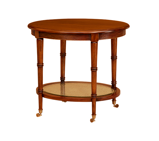 Engelse bijzettafel Nakisha. Gemaakt van massief mahonie hout en uitgevoerd in blond mahonie. De onderzijde is voorzien van een glazen inleg met vlechtwerk aan de onderzijde. Voorzien van messing wieltjes.